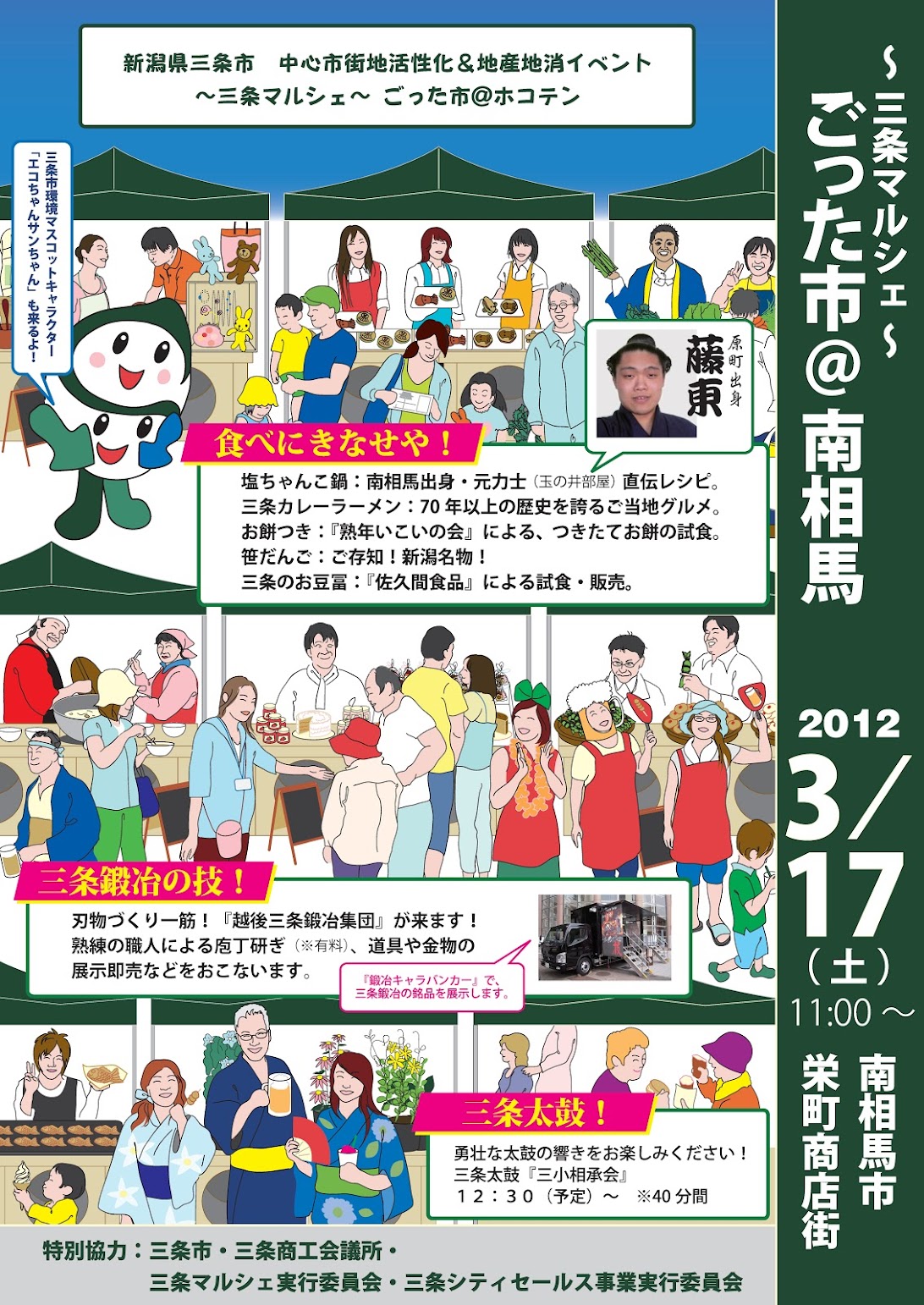 2010_2011ポスターを制作。役所や出店者たちの似顔絵が、イベントへの共感を得るツールとなった。写真は2012年南相馬市復興イベントへの応援出店時のもの